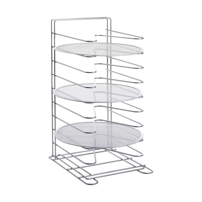 Resistente soporte en varilla de acero para colocar hasta 10 rejillas de pizza desde 38 a 50 cm.. Muy util para colocarlas antes de hornear o tambien despues de hornear. En ambos casos se optimiza muchísimo el espacio en la cocina al almacenar las pizzas en vertical.