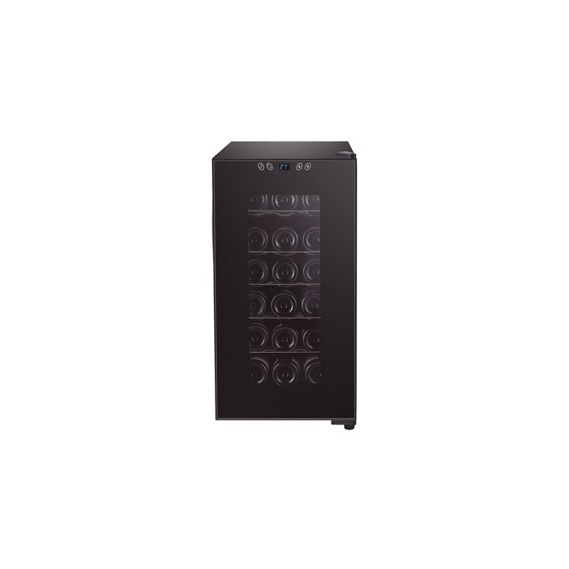 La temperatura interior puede ser ajustada mediante el control electrónico (11ºC-18ºC). Acabado en acero inoxidable y cristal negro. Puerta con cámara de cristal templado y sistema de apertura con tirador. Estantes extraíbles. Silencioso y sistema antivibratorio. Pies regulables en altura. NOTA: Deje suficiente espacio en la parte trasera (mínimo 5 cm) para permitir la salida del calor y una adecuada ventilación. Vinoteca termoeléctrica: el control y regulación de la temperatura dependerá de la temperatura ambiental del establecimiento.CARACTERÍSTICAS TÉCNICAS Tensión: 220-240V 50/60 hz Potencia: 70 W Capacidad: 18 botellas Temperatura: 11ºC - 18ºC Consumo: 146 kwh/annum Ruido: 26 db Capacidad: 50 litros Dimensiones: 34.5x49x67 cm Peso: 17 kg