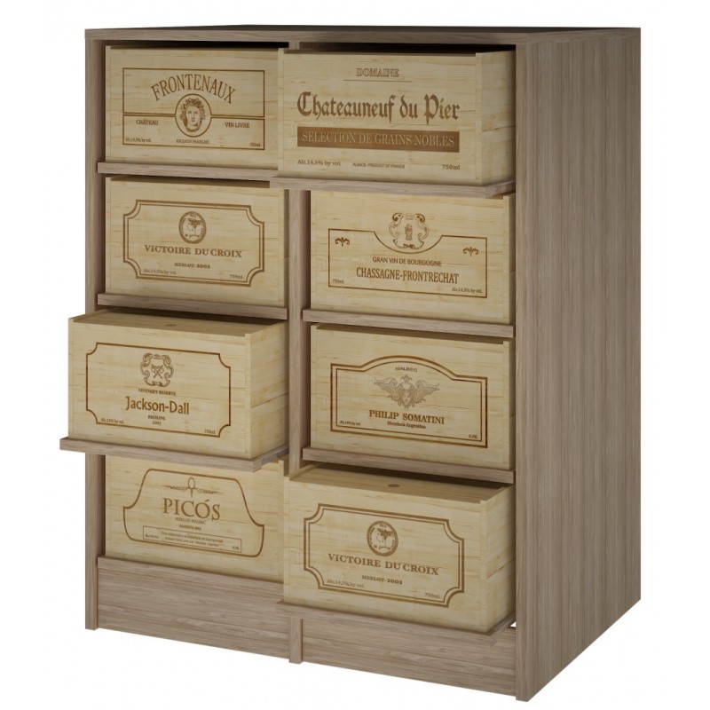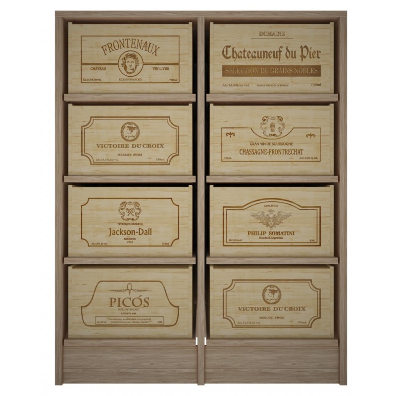 Fabricado con madera de pino o roble, se entrega montado en caja individual. Incluye patas regulables. Incorpora 8 baldas extraibles para cajas de 12 botellas.