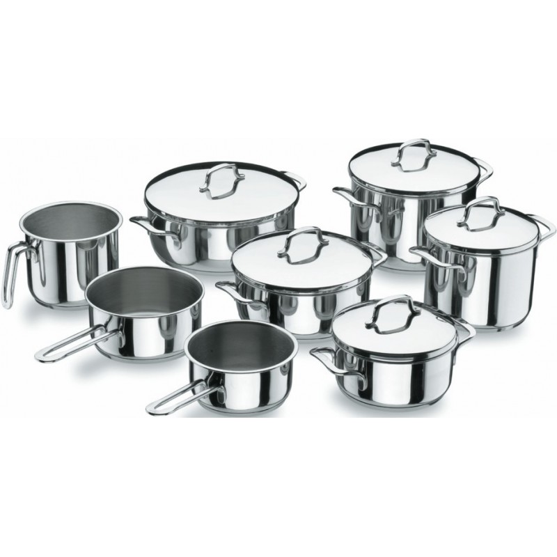 Bateria de cocina Gourmet Lacor fabricada totalmente en acero inox 18/10, con fondo difusor tipo sandwich, compuesto por una capa de aluminio entre dos capas de acero inox 18/10.