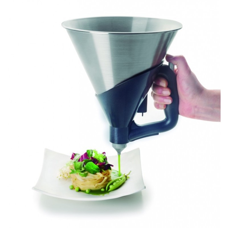 En la repostería profesional el embudo dosificador es imprescindible para realizar un trabajo cómodo, rápido, limpio y preciso: rellenar moldes con masas ligeras o cremas; relleno de pasteles, tartaletas; decoración de tartasEn la cocina salada, además de utilizarlo para rellenos, el dosificador le ayudará a conseguir las mejores presentaciones en el emplatado.Este dosificador es totalmente ergonómico, manejable con una sola mano. La boca superior es amplia para facilitar su llenado y su base proporciona gran estabilidad. Desmontaje rápido y fácil limpieza.Cuenta con 3 boquillas con distintos diámetros (4, 6 y 8 mm) para que las cremas o salsas fluyan en mayor o menor cantidad.El embudo contenedor de este dosificador está fabricado en acero inoxidable 18/10 (aleación con 18% de cromo y 10% de níquel, que ofrece un alto nivel de calidad y resistencia superior al acero convencional). Ofrece una excelente resistencia a la corrosión y a los ácidos alimentarios y sales; es un material liso, no poroso y muy higiénico, fácil de limpiar, y no transmite sabores extraños a los alimentos.Su capacidad es de 2 litros.A través de nuestro correo electrónico puede solicitar todos los repuestos para el dosificador: cono, base, soporte mango y boquillas.