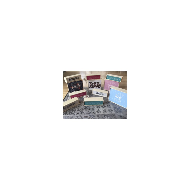 Caja de luz en madera de pino natural. Frontal en metraquilato intercambiable.