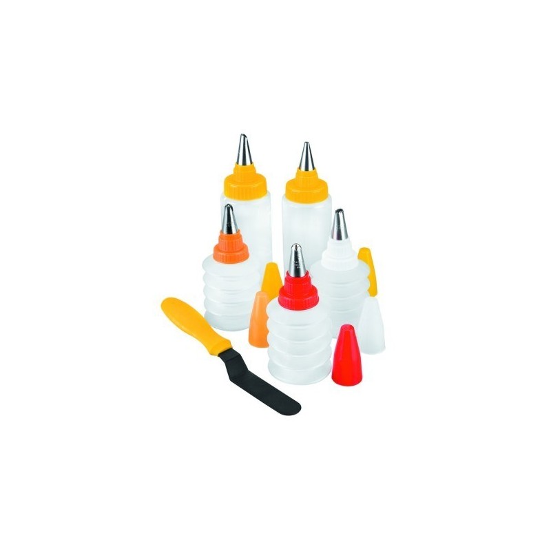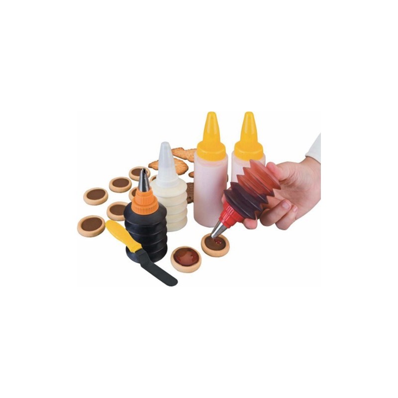 Juego decoracion cupcake compuesto por: 2 botellas con cornete metalico de 180ml. (Ø5x10,5cm.), 3 fuelles decoradores con cornete metalico de 100ml. (Ø5,5x7cm.) y una espatula de nylon de 9cm.