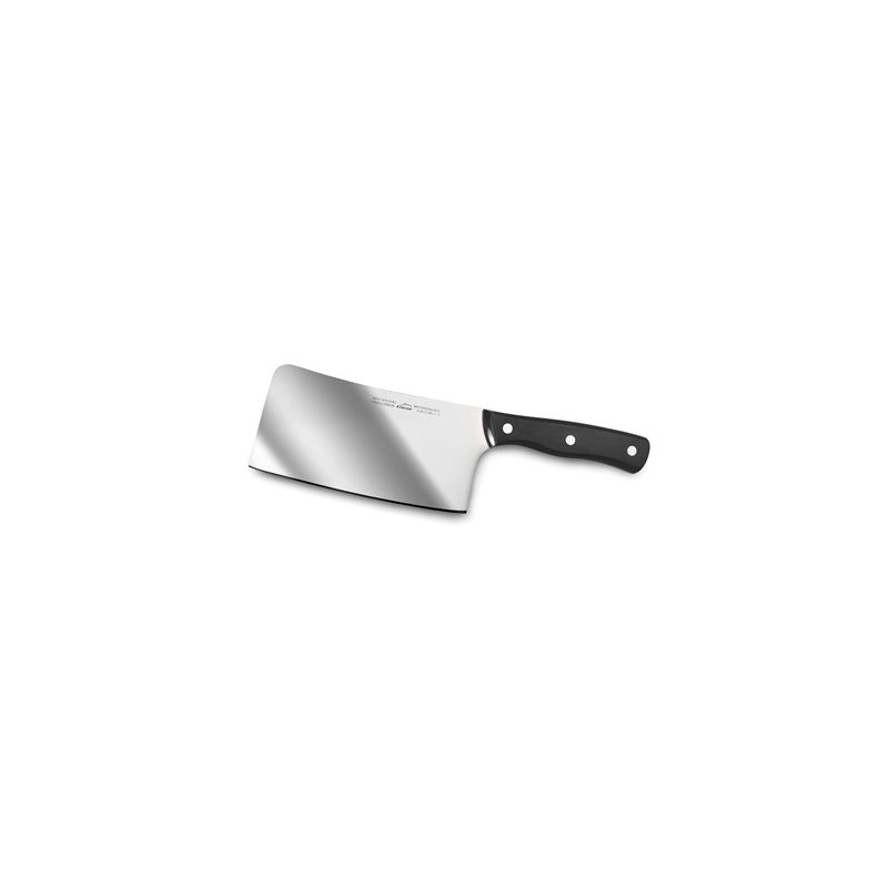 Fabricada en acero inoxidable, con una dureza de HRC56+/-2 (Composición: 5Cr15MoV). Mango de ABS con remaches en acero inoxidable anti-corrosión. Ideal para uso doméstico como profesional. Muy útil para cortar alimentos duros, así como huesos, nervios, cartílagos, etc. El equilibrio y balance de pesos de la macheta favorece el corte.