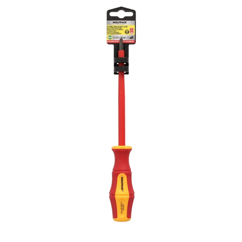 Destornillador Plano Aislado Certificado VDE 1.000 V. Medida 1,2 x Ø 6,5 x 150 mm. Destornillador Seguridad Electricista WOLFPACK LINEA PROFESIONAL