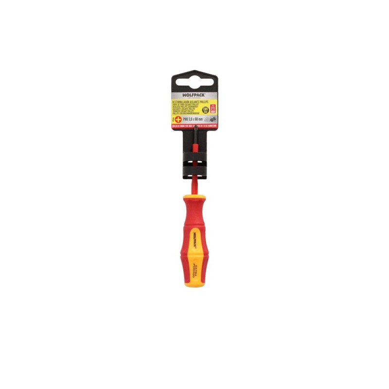 Destornillador Phillips Aislado Certificado VDE 1.000 V. Medida PH 0 - 3,0 x 60 mm. Destornillador Seguridad Electricista WOLFPACK LINEA PROFESIONAL
