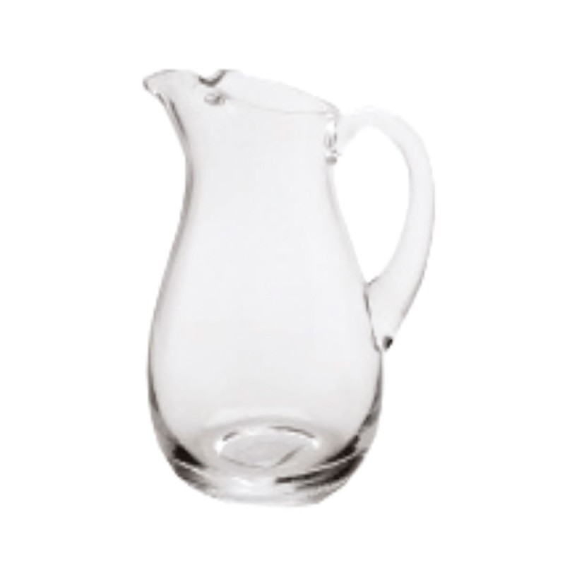 Jarra de vidrio transparente soplada totalmente a boca de forma manual. Vidrio brillante con una terminación excelente. Resistente. Apta para lavavajillas.