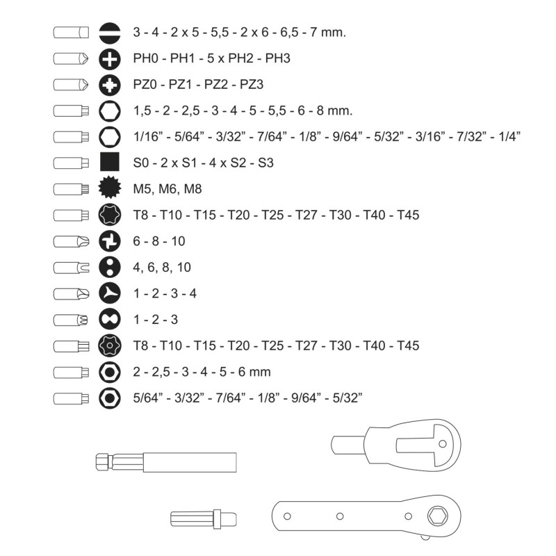 > Torx: 8 / 10 / 15 / 20 / 25 / 27 / 30 / 40 / 45