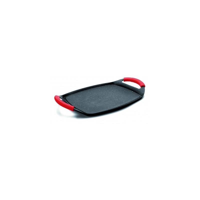La plancha grill ECO STONE está fabricada en aluminio, material muy buen conductor del calor (calentamiento rápido y uniformemente repartido) y muy ligero (reduce el peso y facilita el manejo de los útiles de cocina).El interior de la plancha grill ECO STONE cuenta con una tecnología antiadherente superavanzada: presenta un recubrimiento con tres capas de antiadherente terminado en piedra, hiperresistente a los arañazos. A diferencia de lo que sucede con los antiadherentes convencionales de teflón, en su fabricación no se utiliza PFOA (ácido perfluoroctánico); se reducen las emisiones de CO2 a la atmósfera y es más respetuoso con el medio ambiente.Esta plancha grill ECO STONE, además de su uso como rustidera-fuente de horno retirando las asas de silicona, es apta para su uso en:- Cocinas eléctricas - Cocinas de gas - Cocinas de inducción - Cocinas vitrocerámicasEs un producto apto para lavavajillas.La plancha grill ECO STONE de Lacor se fabrica en 2 tamaños; podrá seleccionar la que desee en el desplegable al lado de la fotografía. Para ayudarle en su elección le damos estas indicaciones:Lados (cm)Altura (cm)29 x 22.51.5037 x 272.00