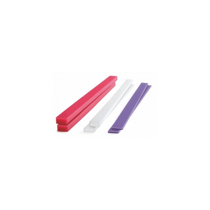 Las tablillas niveladoras de fondant son unas tiras de plástico que se colocan a los lados de la masa para servir de soporte al rodillo y asegurarse de que la masa quede uniforme y sin cambios en su altura. Imprescindibles a la hora de hacer tartas y repostería recubierta de fondant, sirven también para igualar todo tipo de masas, ya se trate de galletas, de hojaldres o de pizzas.Incluye 2 unidades de 3 mm, 2 unidades de 5 mm y 2 unidades de 10 mm