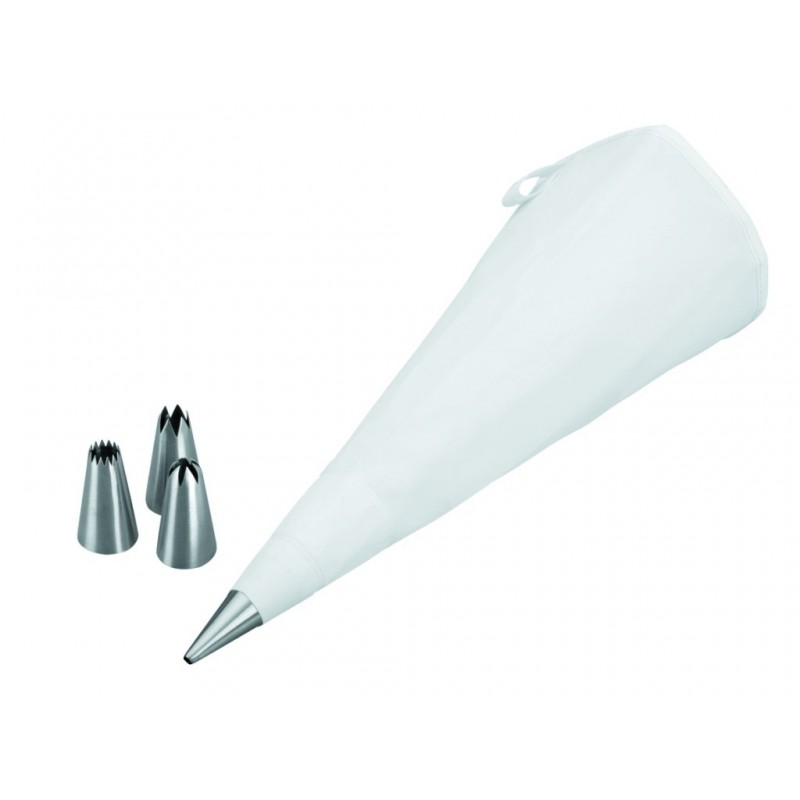 La manga pastelera es un utensilio básico para trabajar con recetas de repostería o pastelería: rellenar buñuelos, canutillos, hacer galletas y merengues, decorar pasteles o tartas con nata, crema Las mangas pasteleras también le ayudarán a mejorar la presentación de muchos platos de cocina: huevos rellenos, purésLacor le ofrece este set de manga de repostería con 4 boquillas. La manga tiene una longitud de 30 cm; es muy resistente, lavable y reutilizable. Las boquillas tienen un diámetro de 25x45 mm y están fabricadas en acero inoxidable de alta calidad, material que ofrece una excelente resistencia a la corrosión y a los ácidos alimentarios y sales; es liso, no poroso y muy higiénico, fácil de limpiar.