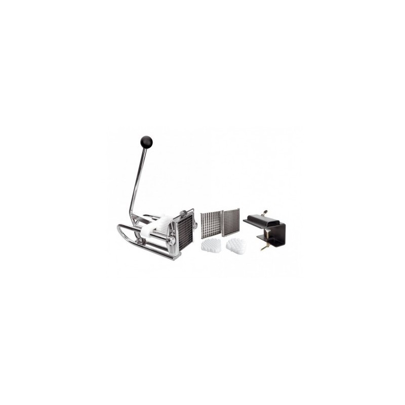 Esta máquina corta patatas con 3 cortadores está ideada para uso en cocinas profesionales. Con ella obtendrá rápidamente y sin esfuerzo patatas cortadas en bastones del mismo grosor, permitiendo una fritura homogénea.La máquina para cortar patatas es una pieza robusta provista de una brida para sujetarla firmemente a la superficie de trabajo. El diseño reduce al mínimo el esfuerzo necesario para que, al presionar la manivela, la patata atraviese las cuchillas y salga cortada.Esta máquina corta patatas está provista de 3 cortadores intercambiables, con tamaño de corte de 6x6 mm, 8x8 mm y 10x10 mm.