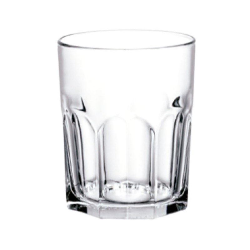 Vaso de vidrio prensado con diseño clásico y una resistencia máxima al choque mecánico. Brillante y apto para limpieza en lavavajillas.