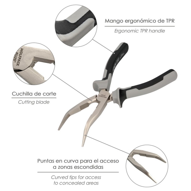 alicates na boca curvada 200 mm. Chrome Vanadio Steel Din -Iso 5745 Punta Curved Punta, alicates de boca longa curvada, linha profissional de Wolfpack