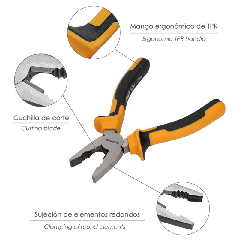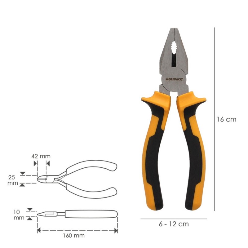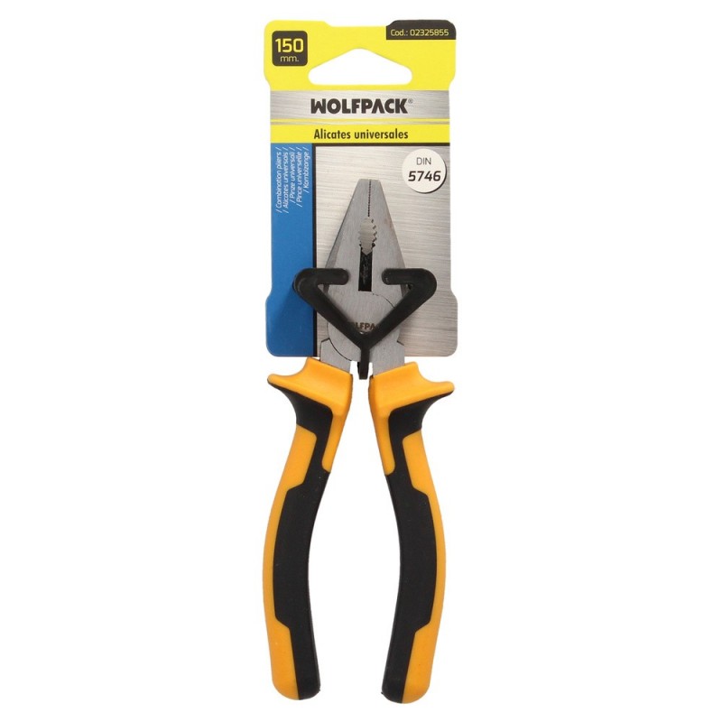 alicate universal 150 mm. DIN 5746 Profissão de Wolfpack feita no TPR, com base plástica e aderência de goma. Ele se adapta à forma da mão, sendo capaz de transmitir a força máxima possível de uma maneira confortável. Conforto ergonômico e máximo de uso. Fabricação sob DIN 5746.