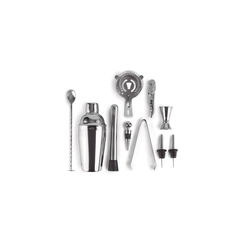 Indispensable tanto para profesionales como para aficionados. Mantiene todas las herramientas organizadas y elegantemente mostradas. Diseño portátil. Ideal para preparar fácilmente todo tipo de cócteles. Piezas fáciles de limpiar.Compuesto por:Cucharilla cocktail Coctelera Maza mojito Colador gusanillo Sacacorchos Dosificador licor Pinza Tapón Dos boquillas servidoras Soporte