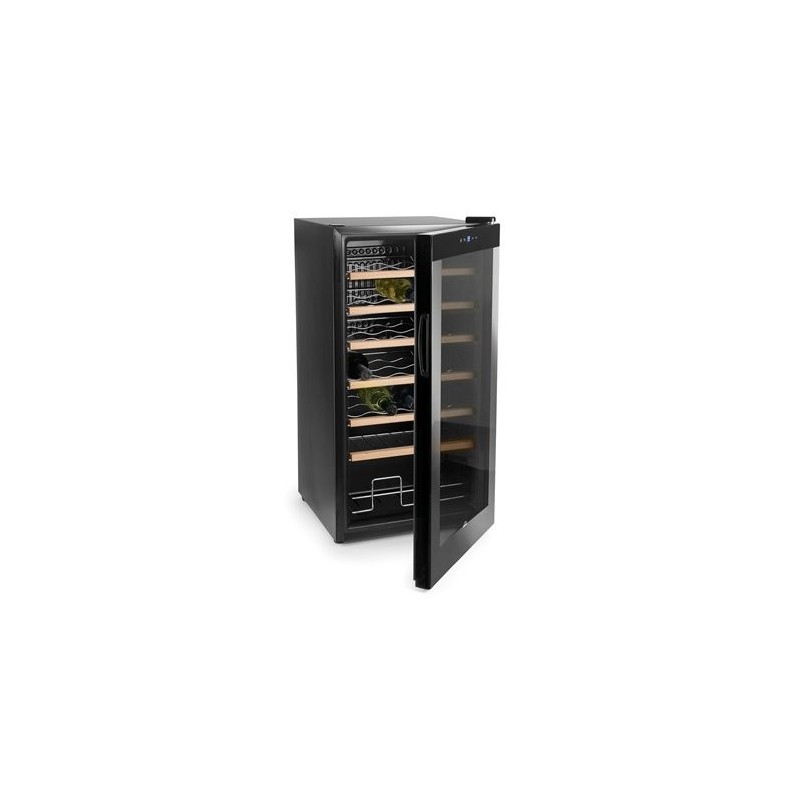 Acabado en acero inoxidable y cristal negro. Puerta con cámara de cristal templado y sistema de apertura con tirador. Iluminación interior. Display luminoso de control de temperatura digital. Estantes extraíbles acabados en madera. Capacidad para 18 botellas. Rango de temperatura: 5-18°C. Silencioso y sistema antivibratorio. Pies regulables en altura.Características técnicas:Referencia:69239 Tensión: 220-240 V; 50/60 Hz Potencia: 85 W Capacidad: 18 botellas Rango de temperatura: 5ºC - 18ºC Sistema enfriamiento: compresor Consumo: 120 kwh/año Ruido: 42 db Dimensiones: 34.5x45x77.5 cm Peso: 21 kg