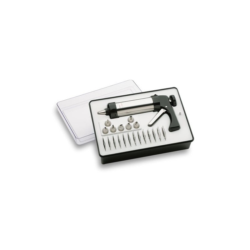 A massa de decoração de armas Lacor ideal para a decoração de massa feita de aço inoxidável 18/10, equipada com 7 bicos e 13 discos para decorar.