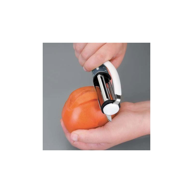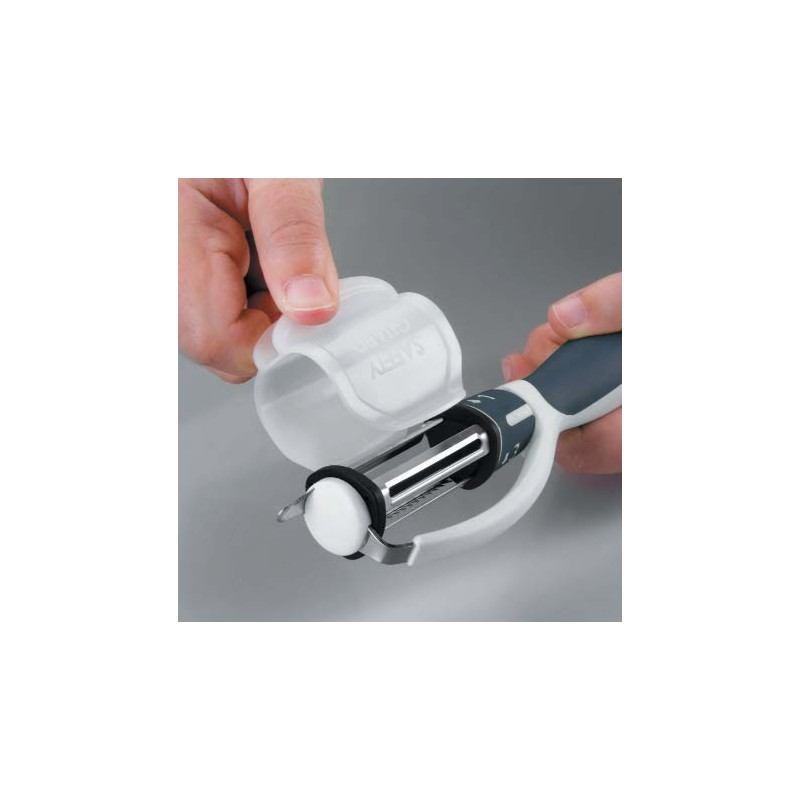 Descascando lâminas giratórias equipadas com três lâminas embutidas, que simplesmente com uma simples torção adaptamos para corte suave (batatas, abobrinha, cenoura...) corte severo (tomates e frutas delicadas) ou cortado em julienne como precisamos. Equipado com um protetor para evitar cortes nos dedos e nas mãos e para preservar a lâmina é o seu armazenamento.