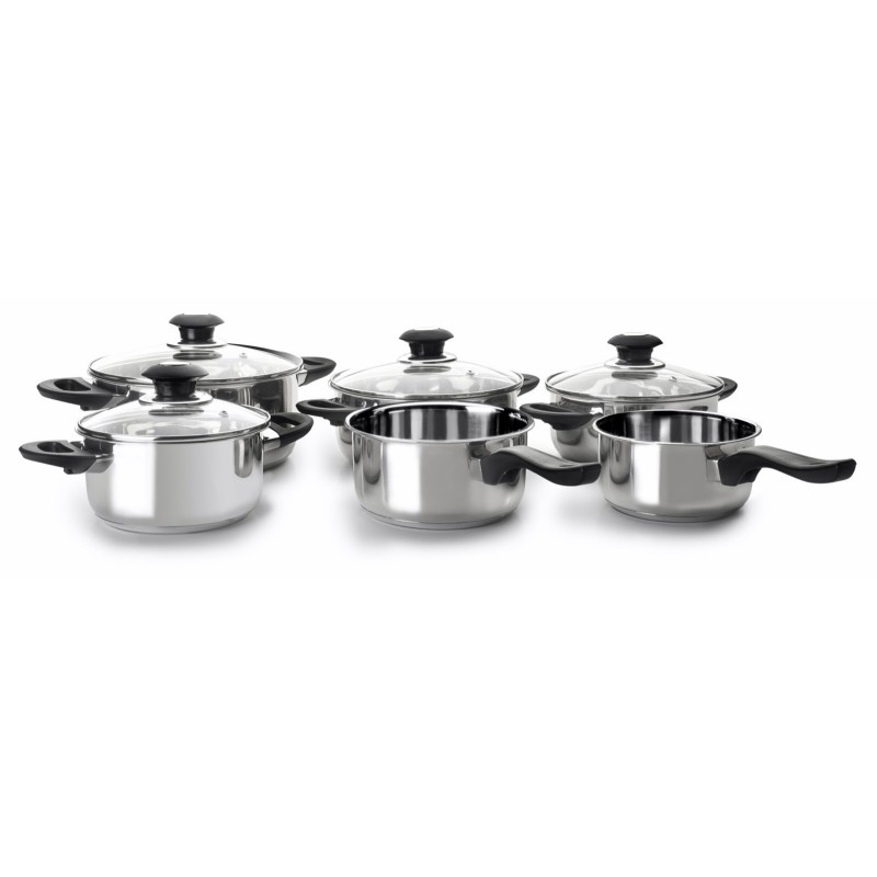 Bateria de cozinha de 6 peças, aço inoxidável, tampa de vidro e alça revestida preta
