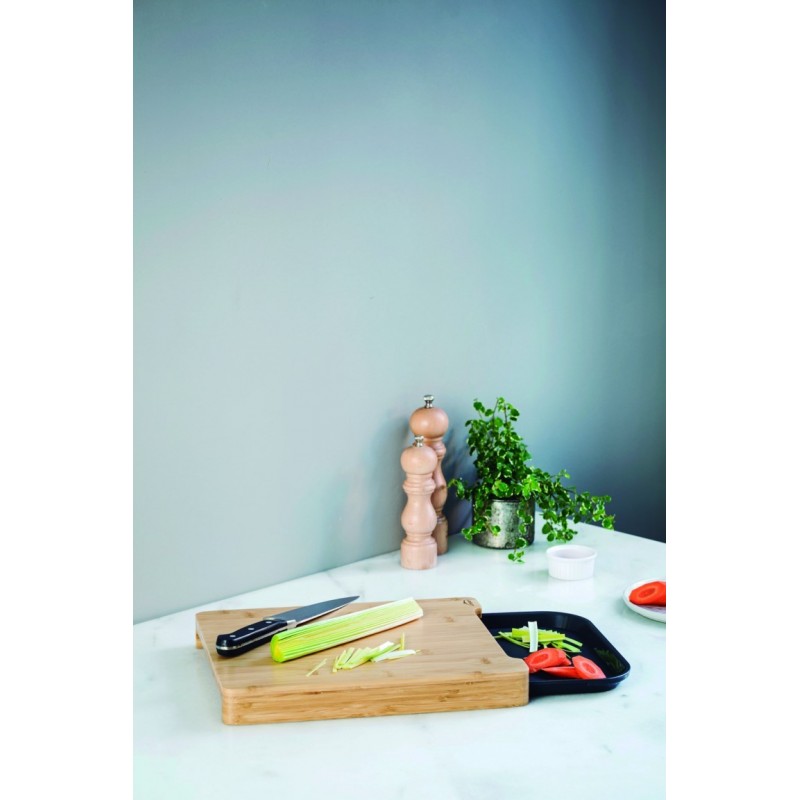 fabricado em Bambu e polipropileno. Robusta e alta durabilidade. Inclui balde de polipropileno. Livre de BPA. O balde é adequado para a máquina de lavar louça. Completamente removível. Tabela de corte tratada com um revestimento protetor e antibacteriano. Balde removível para coletar alimentos cortados. Os pés não deslocam, garante a estabilidade da mesa durante o corte.Na parte inferior, a mesa de corte de coleta mantém um balde de polipropileno (incluído) que pode ser extraído e usado para coletar cortes de alimentos com grande facilidade e sem o risco de cair ao movê -los.Dimensões da tabela: 35x29x4 cm Dimensões do balde: 34x26,5x2 cm