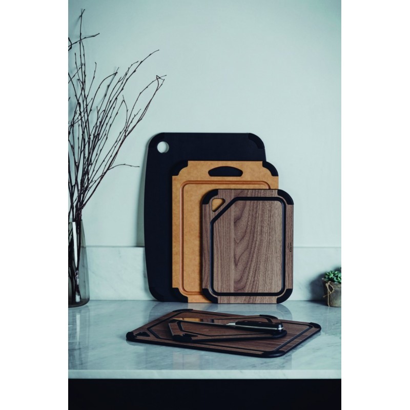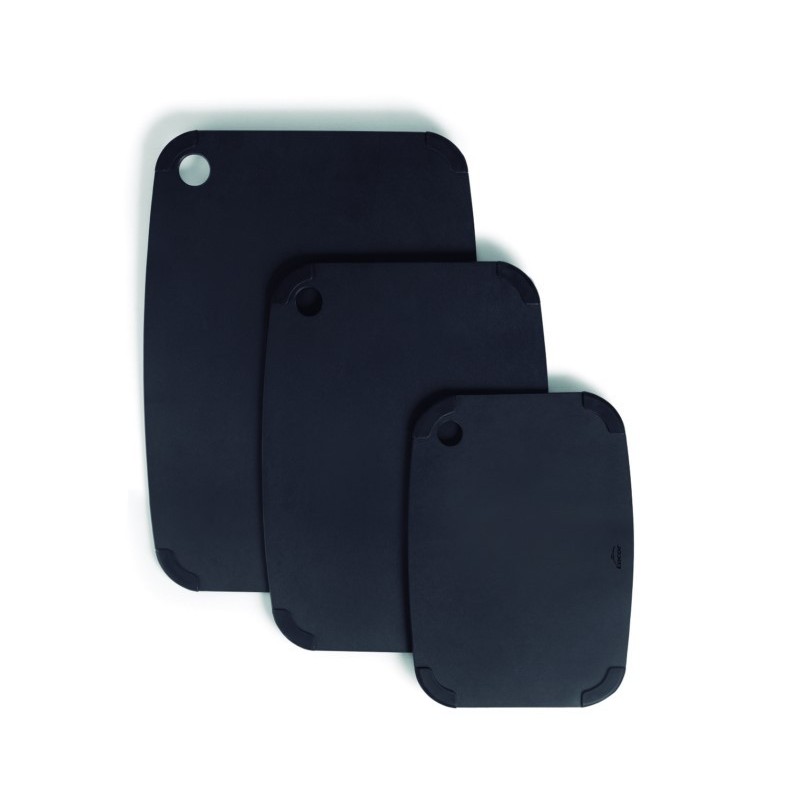 Tabla de corte fabricada en fibra de madera, materiales naturales y ecológicos. Duradera, resistente, indeformable y anti-bacteriana. Las fibras de madera ayudan a mantener el filo de los cuchillos afilado durante más tiempo. Su diseño permite darle un doble uso, tanto para la cocina como para el servicio en mesa y se pueden usar por ambos lados. GRIPsystem, pies singulares fabricados en silicona para utilizar las tablas en cualquier superficie sin riesgo de deslizamiento. El orificio es perfecto para colgar la tabla y facilitar su almacenaje.La tabla de corte BLACK está disponible en 3 medidas:30x21.5 cm 37x27.5 cm 44x32.5 cm