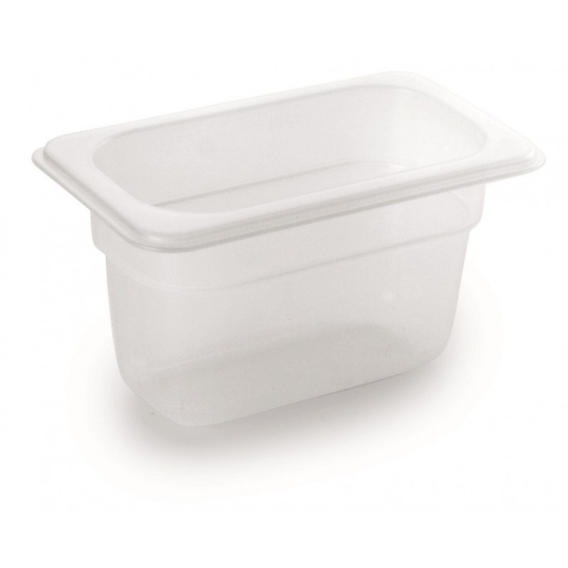 CUBETA GN 1/9 POLIPROPILENOEn nuestra página encontrará toda la gama de cubetas Gastronorm que Lacor pone a disposición de profesionales de hostelería y restauración.Esta cubeta Gastronorm está fabricada en polipropileno, material plástico apto para uso alimentario y caracterizado por su estabilidad tanto frente a productos alcalinos como ácidos. Las cubetas fabricadas con polipropileno son utilizables en temperaturas comprendidas entre -40ºC y 70ºC. El polipropileno es un material apto para uso en procesos de refrigeración, preparación y distribución de alimentos. Las cubetas fabricadas con este material son ligeras y apilables; las tapas de estas cubetas de polipropileno permiten su cierre hermético. Las cubetas Gastronorm fabricadas en polipropileno son higiénicas, aptas para uso en lavavajillas.En el desplegable al lado de la fotografía podrá seleccionar entre las medidas disponibles para las cubetas GN 1/9 en polipropileno (176 x 108 mm):ReferenciaAltura (mm)Capacidad (l)66965H650.7066910H1001.00La normativa europea EN-631 establece bajo el término Gastronorm (GN) el formato estándar para recipientes utilizados en el tratamiento de alimentos en cocinas profesionales, en cualquiera de sus procesos: preparación - cocción - almacenaje - conservación - transporte - limpieza. Esta estandarización permite optimizar la ordenación y máxima utilización de espacio en los equipos de cocina, transporte y almacenaje: estanterías de almacenamiento, carros, armarios, hornos, frigoríficos, buffetEl formato básico es el GN 1/1: 530 x 325 mm. Los demás son fracciones o múltiplos de ese tamaño, resultando esta lista:GN1/1 : 530 × 325 mmGN1/2 : 325 × 265 mmGN1/3 : 325 × 176 mmGN1/4 : 265 × 162 mmGN1/6 : 176 × 162 mmGN1/9 : 108 × 176 mmGN2/1 : 650 × 530 mmGN2/3 : 354 × 325 mmGN2/4 : 156 x 530 mmAdemás de largo y ancho, Gastronorm también establece profundidades estándar: 10, 20, 40, 65, 100, 150 y 200 mm (y por tanto las capacidades de los recipientes)
