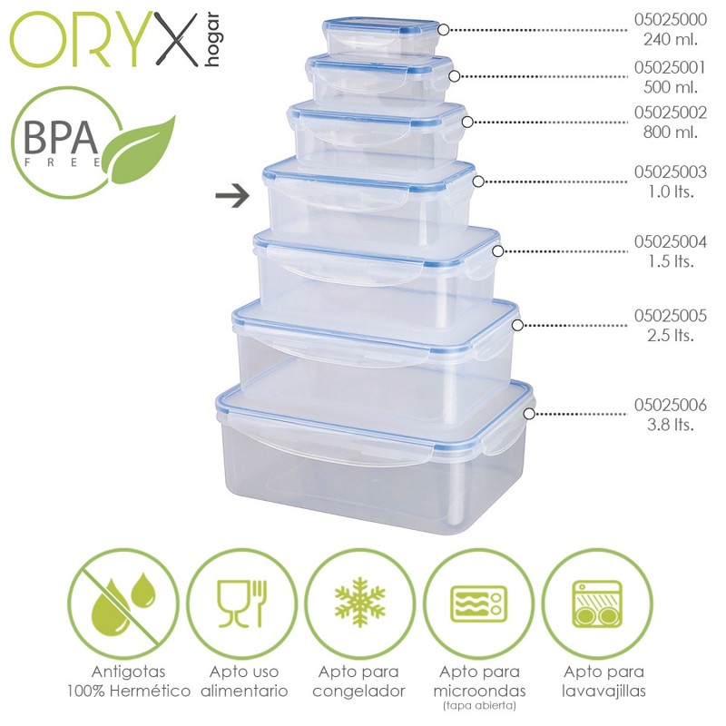 Recipiente hemico de plástico retangular 1.000 ml. 19x12.5x6.5 (Alt.) CM. Oryx