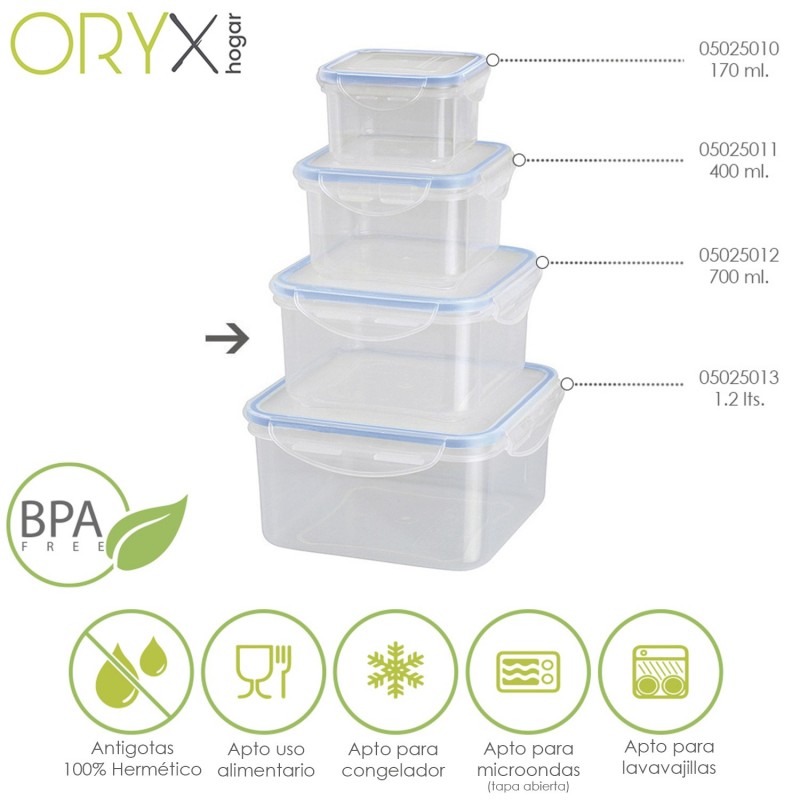 Recipiente de hospedagem de plástico quadrado 700 ml. 13x13x7 (alt.) CM. Oryx