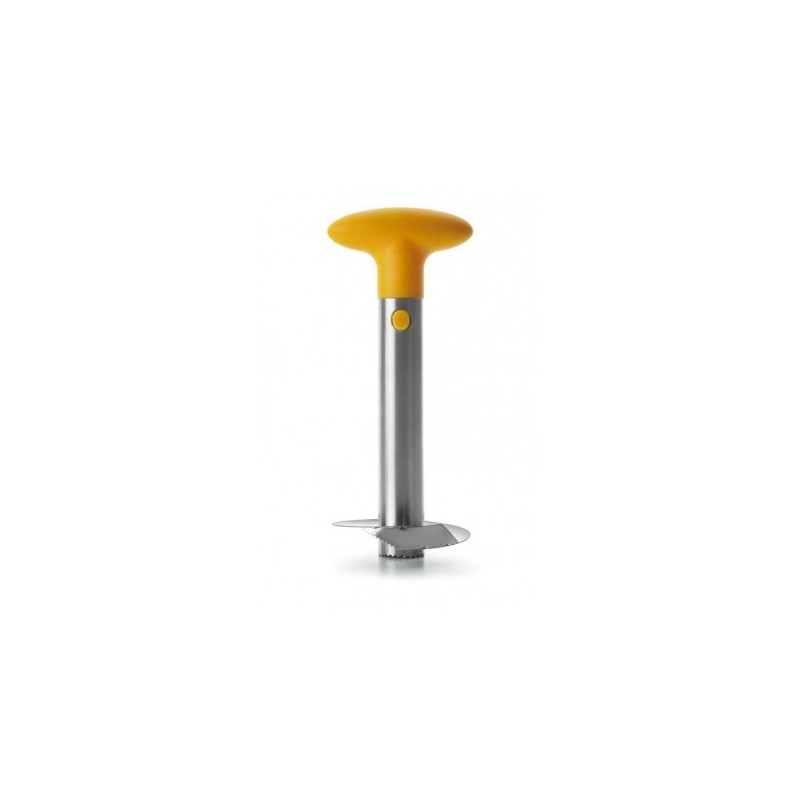 El pelador de piñas First Class de Ibili pela, separa el corazón, corta y extrae la carne de una piña fresca en un momento y sin esfuerzoEl método es rápido y fácil. Después de cortar la parte superior de la piña se enrosca el pelador como si fuese un sacacorchos; el corazón duro queda separado en el cilindro central y la pulpa se extrae en rodajas perfectas. Con un giro, una rodaja, y con varios, la piña entera.El resultado final es un gran cilindro de piña fresca con forma de espiral, preparado para comer y muy decorativo. El exterior de la piña permanece entero y puede utilizarse como recipiente para postres o bebidas.Fabricado en acero inoxidable para más resistencia y una enorme durabilidad.