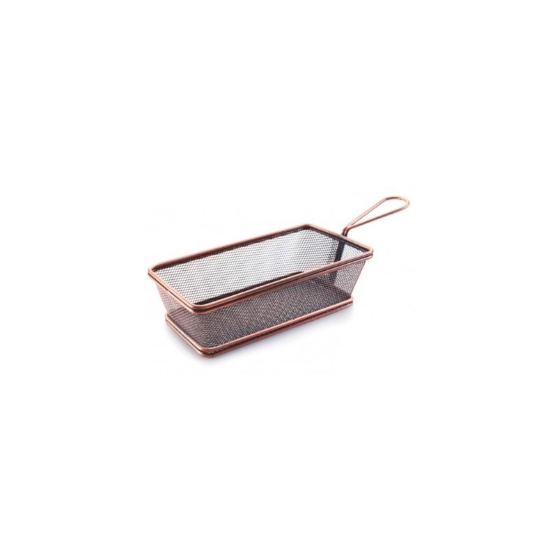 Fabricados en acero inoxidable. Acabados con un recubiertos de pintura niquelada. Una forma elegante y original de servir toda clase de aperitivos y tapas. La presentación puede ser sobre papel absorbente o bien directamente sobre el cestillo.Referencia Medida (cm) Altura (cm) 61066 21x11 6