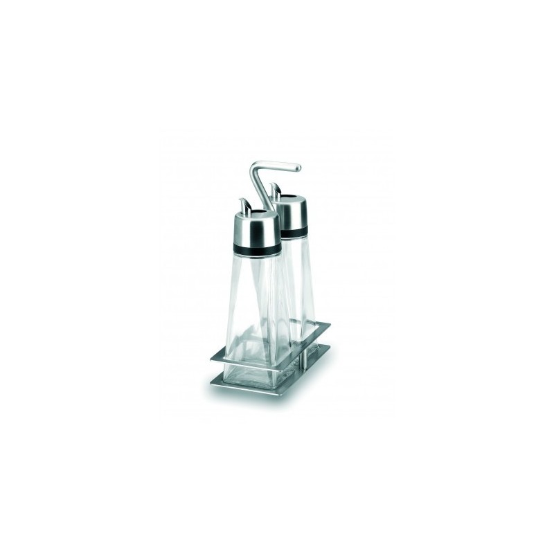 El juego de vinagreras Hiperlux con soporte es adecuado tanto para uso profesional como doméstico; práctico y útil para que los comensales pongan un punto personal a sus platos, cómodo para evitar desplazamientos de la mesa a la cocina.El juego de vinagreras Hiperlux de 2 piezas con soporte dispone de dispositivo antigoteo y un sistema regulador patentado para dosificar la cantidad a verter: dos posiciones intercambiables para obtener mayor o menor cantidad de líquido.El juego de vinagreras Hiperlux de 2 piezas con soporte está fabricado en acero inoxidable 18/10 (aleación con 18% de cromo y 10% de níquel, que ofrece un alto nivel de calidad y resistencia superior al acero convencional). Ofrece una excelente resistencia a la corrosión y a los ácidos alimentarios y sales; es un material liso, no poroso y muy higiénico, fácil de limpiar, y no transmite sabores extraños a los alimentos.Este juego de vinagreras modelo Hiperlux incluye 2 piezas:1 Aceitera de 200 ml 1 Vinagrera de 200 mlEn nuestra página puede encontrar también el juego de vinagreras Hiperlux de 4 piezas (vinagrera, aceitera, salero y pimentero), el juego de salero y pimentero Hiperlux y el palillero Hiperlux.Además, a través de nuestro correo electrónico puede conseguir repuestos para todas las piezas de la serie de complementos de mesa Hiperlux.