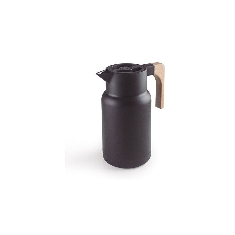 Jarras termo que mantienen los líquidos calientes y fríos durante horas. Capacidad de 1 L, ideal para servir café, leche o té. Cuerpo de polipropileno en color negro/blanco mate, ligero y muy cómodo. Asa de madera de haya ergonómica. Doble pared con una capa de vidrio en el interior que proporciona un alto rendimiento térmico. Tapa aislante de rosca con botón de apertura que mantiene el calor y dispensa fácilmente las bebidas. Uso muy sencillo y eficaz, podrás manejarlo con una sola mano.