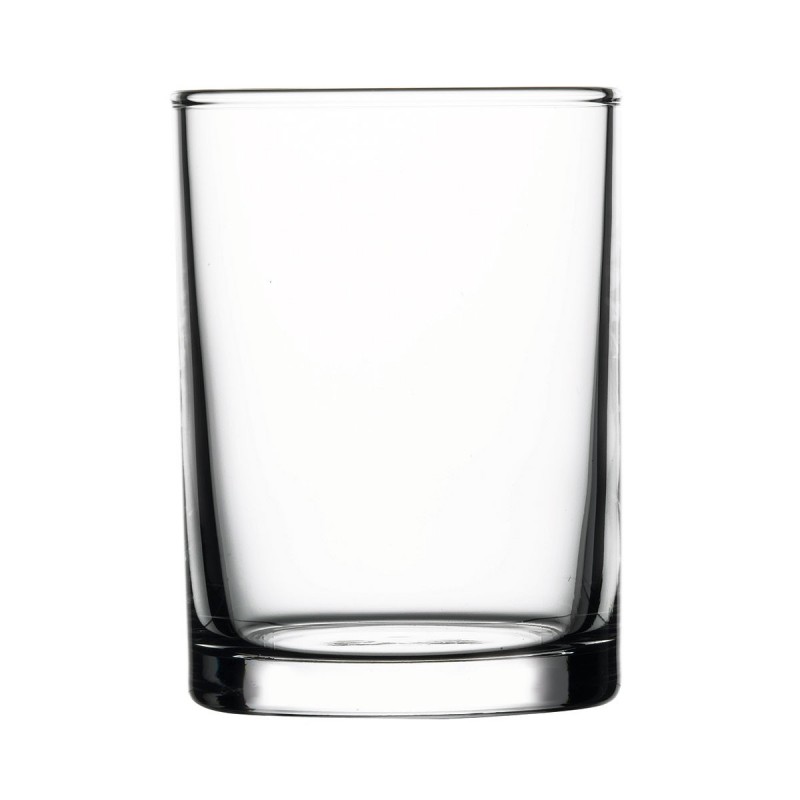Vaso de vidrio prensado con diseño clásico y una resistencia máxima al choque mecánico debido a su proceso de templado. Brillante y apto para limpieza en lavavajillas.