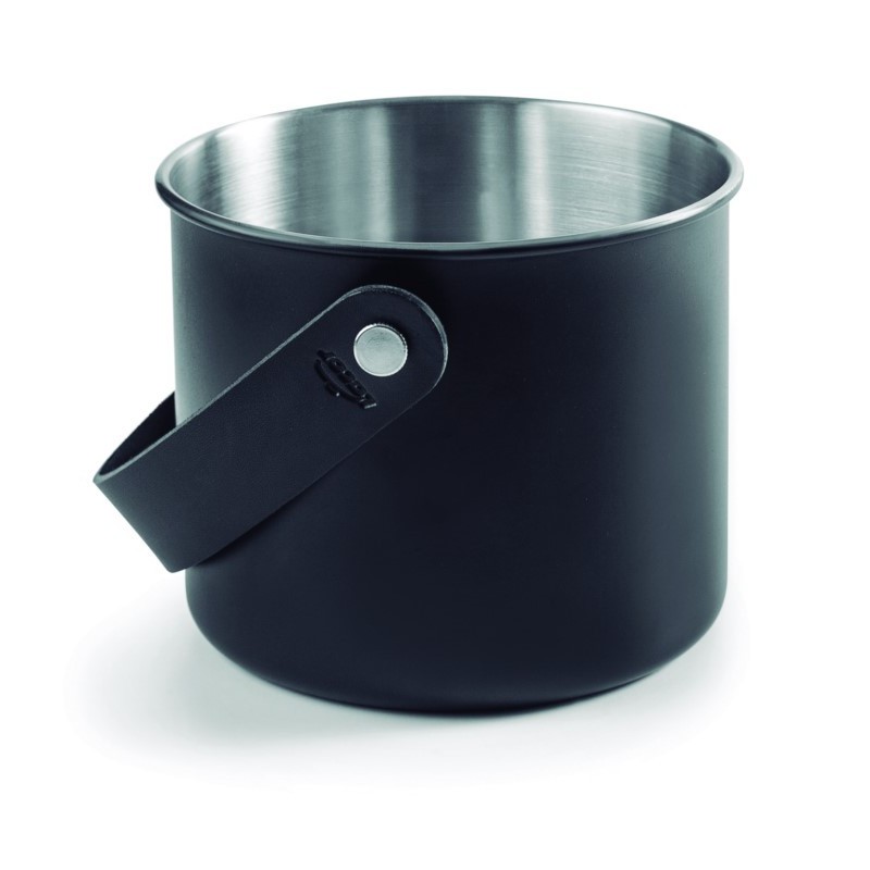 corpo de aço inoxidável 10/ 18, resistente à corrosão. Design elegante e atual. A alça de couro Vacua acabou em bronzeamento vegetal de 3 mm de espessura. Acabamento externo preto fosco e interior.Diâmetro: 14 cm e capacidade: 1,5 litros.