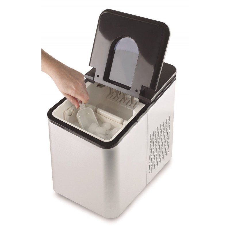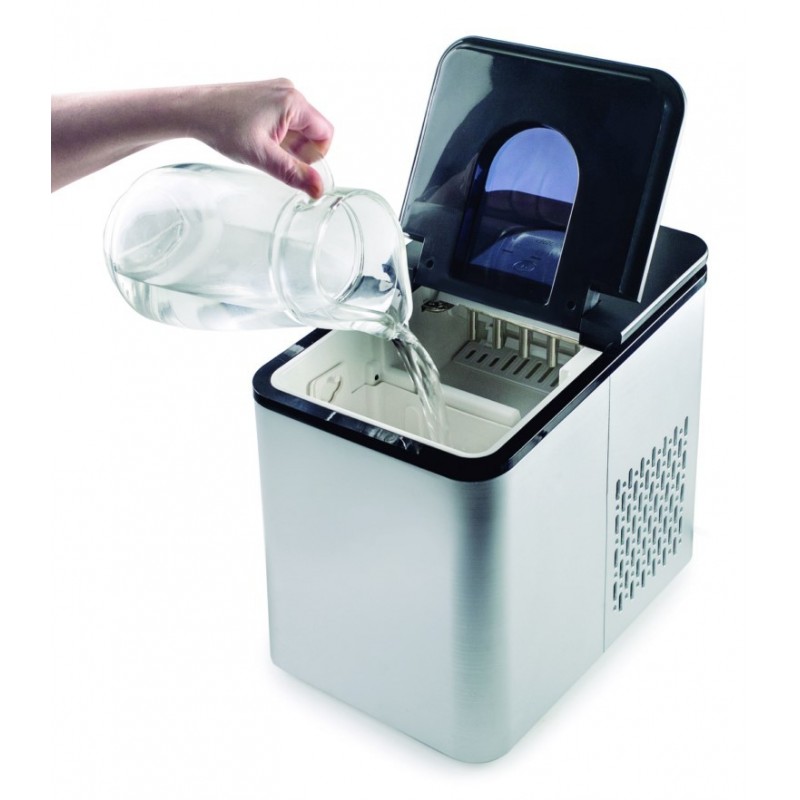 Funcionamiento sencillo e intuitivo: rellena el depósito de agua y en pocos minutos se generarán los primeros cubitos de hielo. Ciclo de producción: 12kg en 24 horas / 9 cubitos por ciclo (cada ciclo es de 8 minutos aprox.). Forma de cubito de hielo: Bala (26 x 30mm). Ciclo de producción automático y silencioso. Detección por infrarrojos: se para automáticamente si detecta el contenedor lleno. Alarma acústica si el depósito está lleno o necesita más agua. Ventana transparente para ver el proceso sin necesidad de abrir la máquina. Incorpora un tapón en la base para el vaciado del agua. Tamaño compacto: 36 x 24 x 33cm