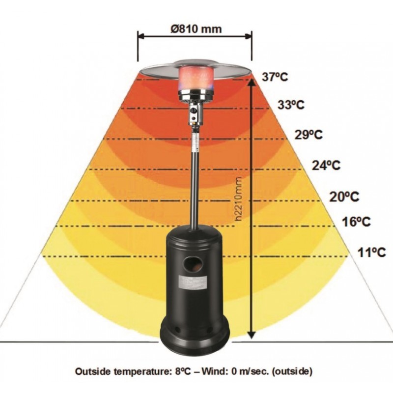 Las bajas temperaturas no tienen por qué suponer el cierre de las terrazas y zonas exteriores en los establecimientos; existen sistemas de calentamiento que permiten acondicionarlas para su uso durante todo el año, mejorando su facturación y rentabilidad.Para quienes prefieran los sistemas clásicos los calentadores a gas son una buena opción en lugares bien ventilados (recuerde: solo uso en exteriores), creando un ambiente cálido incluso en días muy fríos.Este modelo de calentador para terrazas funciona con gas propano o butano. Su potencia es de 12 KW (máximo). Su altura es de 2.25 m y el diámetro del reflector es de 80 cm. Su peso es de 20 kg.Puede transformar este calentador de terraza en una mesa (40 cm de diámetro) mediante un accesorio (ref. R69400A) que puede solicitarnos mediante correo electrónico o telefónicamente. También están disponibles el juego de ruedas de acero para transportar cómodamente el calentador (ref. R69400R, color blanco), y la funda (R69400N) para mantener el calentador protegido cuando no se use.