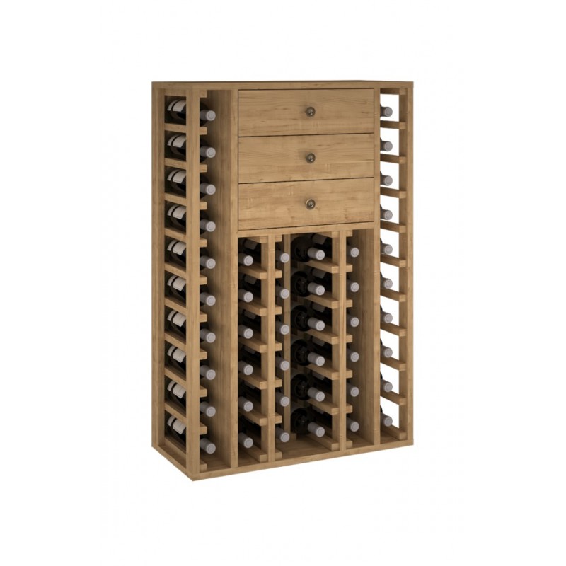 Feito de madeira de pinheiro ou carvalho, é entregue montado em caixa individual. Inclui pernas ajustáveis. Incorpora 3 gavetas com capacidade para garrafas ou acessórios.